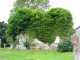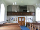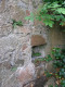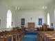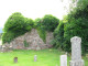 A short way to its south, and within the same graveyard, are the remains of the medieval church, which is unfortunately now so heavily swathed in ivy that it is difficult to make out many of its features. Its width from north to south is 7.6 metres, with walls of about 1 metre in thickness, but its length from east to west is unknown. Although one account says that there was a window in the east wall, there is now no visible evidence of this. A chamfered intake at the base of the gable points to the likelihood of a late medieval date of construction. Internally, at the south end of the east wall, there is a small square aumbry with no rebates for a door frame. Immediately adjacent to that aumbry, in the south wall, is the splayed jamb of a window embrasure, but the ivy growth makes it difficult to determine the form and likely date of the window. There is another splayed embrasure jamb at the broken west end of the wall. Between those two windows is a recess that is bridged by a segmental arch. Since this appears too small to have been intended as sedilia, it may have been a credence recess; there is also the possibility that it was a tomb recess. Traces of a higher opening to the west of this recess have been interpreted as the doorway to a post-medieval loft; an alternative interpretation might be that it was a window lighting a rood loft, but, again, the dense ivy growth does not permit anything approaching certainty.